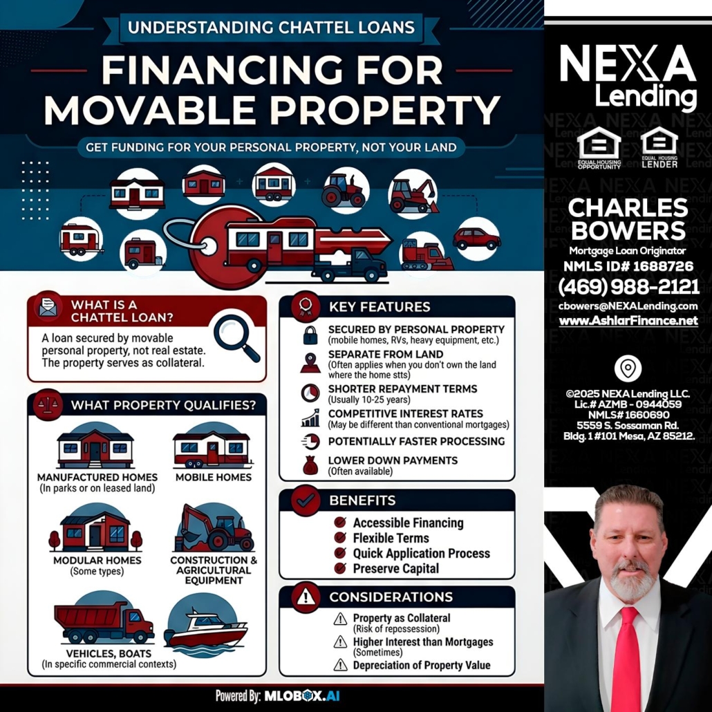 Hi, my name is Charles Bowers. I’m a Loan Officer offering personalized mortgage solutions, fast customized quotes, great rates and service with integrity. If you’re interested in learning more about the Chattel loan or any other, just let me know and I’ll walk you through your options.